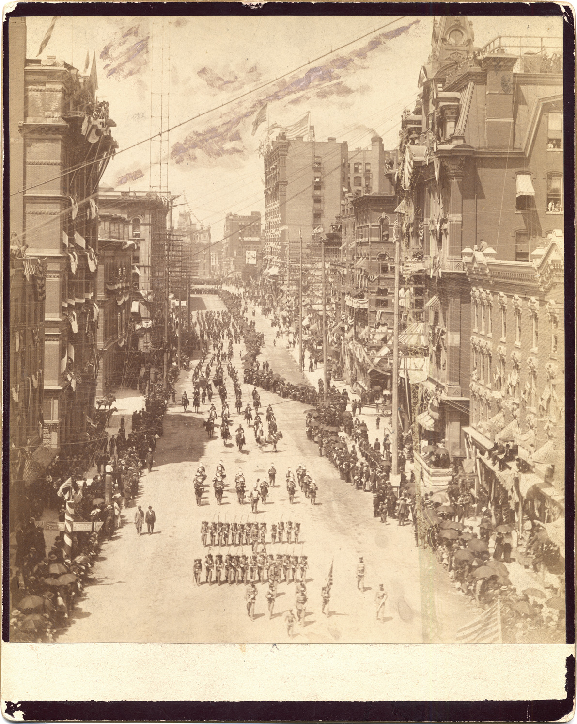 Favorite this☆ G.A.R. parade down Griswold Description: View from a height up Griswold, with crowds on sidewalks watching parade. Infantry followed by band and calvary. Handwritten on mat back: "Looking north, Aug 3, 1891 - Griswold St. View up Griswold St. during National Encampment G.A.R., 1891." Details Resource ID: DPA2211 Subject: Grand Army of the Republic. National Encampment Parades--Michigan--Detroit Albumen prints Photographic prints Date Issued: 1891-08-03 Format: 1 photographic print mounted on mat board ; image 8.75 x 7.75 in. Member of: Burton Historical Collection Filing Location: D/Conventions-G.A.R. Rights: Physical rights are retained by DPL. Copyright is retained in accordance with U.S. copyright laws.