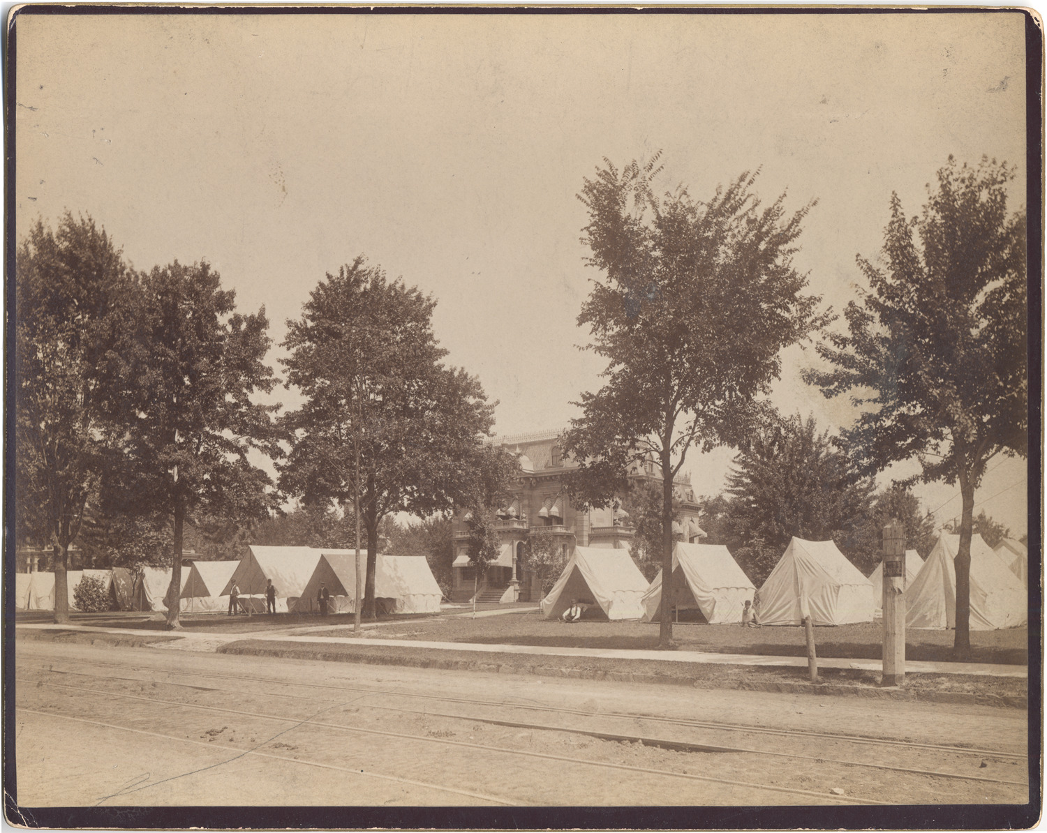 Favorite this☆ Camp of 1st Massachusetts at G.A.R. encampment Description: Tents in front of Pingree residence, with a few men. Handwritten on mat back: "The G.A.R. in Detroit 1891. View of Mayor Pingree's residence. Camp of the 1st Mass. Heavy Artillery, Mayor Pingree's old regiment." Details Resource ID: DPA2212 Subject: Grand Army of the Republic. National Encampment United States. Army. Massachusetts Heavy Artillery Regiment, 1st (1861-1865) Pingree, Hazen S., 1840-1901--Homes and haunts--Michigan--Detroit Albumen prints Photographic prints Date Issued: 1891-08 Format: 1 photographic print mounted on mat board ; image 7.75 x 9.75 in. Member of: Burton Historical Collection Filing Location: D/Conventions-G.A.R. Rights: Physical rights are retained by DPL. Copyright is retained in accordance with U.S. copyright laws.