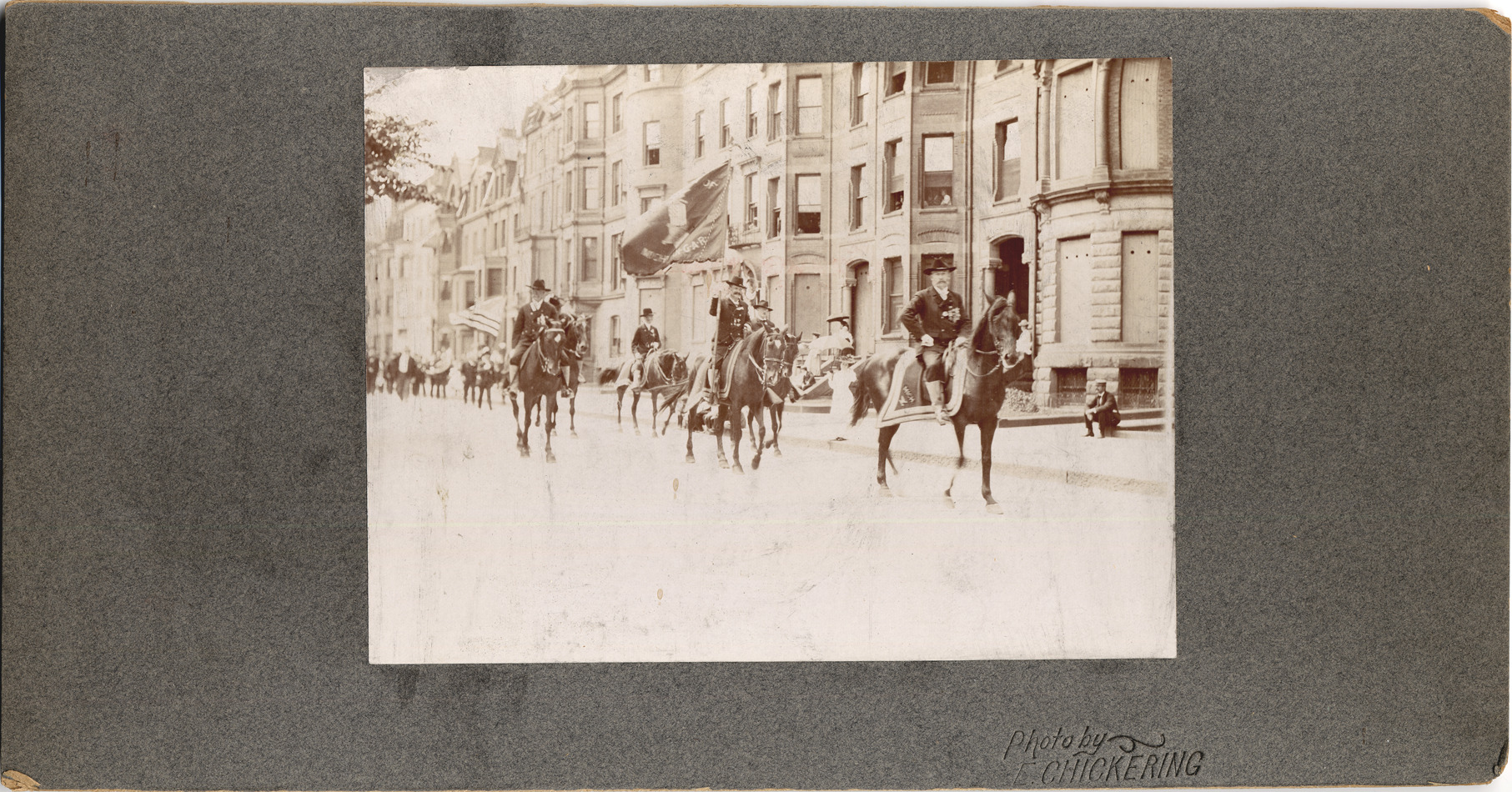 Favorite this☆ Officers on horseback Description: Officers on horseback lead infantry past bow-fronted apartment houses. Banner reads: " ... of Michigan, G.A.R." Very few spectators. Several windows boarded up or shuttered. Embossed on mat front: "Photo by Chickering." Details Resource ID: DPA2216 Creator: Chickering Subject: Grand Army of the Republic. National Encampment Parades--Michigan--Detroit Photographers--Michigan--Detroit Albumen prints Photographic prints Date Issued: 1891-08 Format: 1 photographic print mounted on mat board ; image 5 x 6.5 in. Member of: Burton Historical Collection Filing Location: D/Conventions-G.A.R. Rights: Physical rights are retained by DPL. Copyright is retained in accordance with U.S. copyright laws.