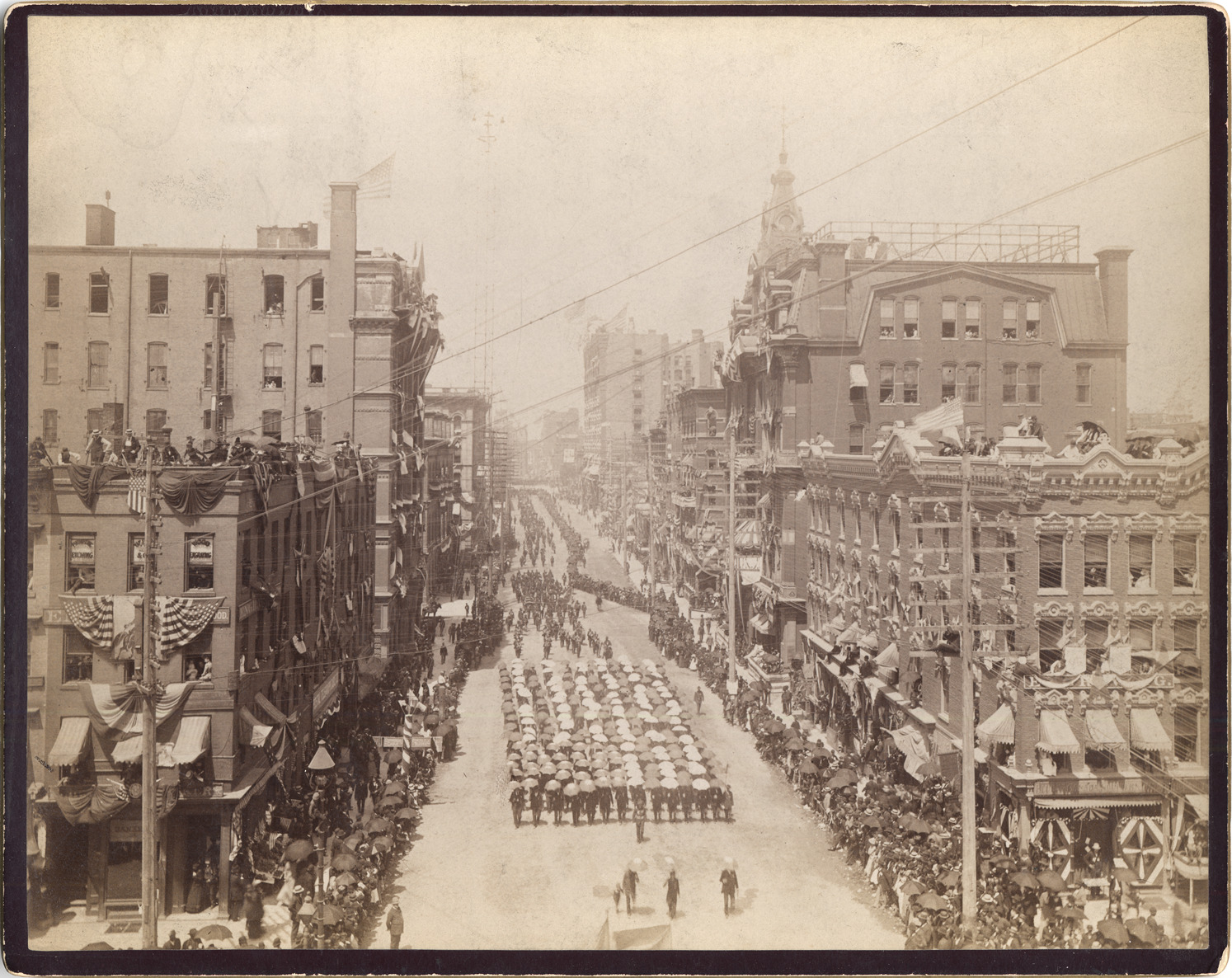 View from a height directly up Griswold. Marchers holding umbrellas form U.S. flag. Spectators at street level, in windows, and on roofs. Handwritten on mat back: "G.A.R. in Detroit in 1891. View looking up Griswold St. from Jefferson Ave. The Geo. H. Thomas Post of Chicago, in the foreground, marching with red, white and blue umbrellas representing the American flag."