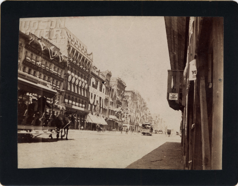 Horse-drawn streetcars on Woodward. Buildings decorated for G.A.R. encampment. Handwritten on card back: "West side Woodward Ave. just above Campus. Aug. 3-8, 1891."