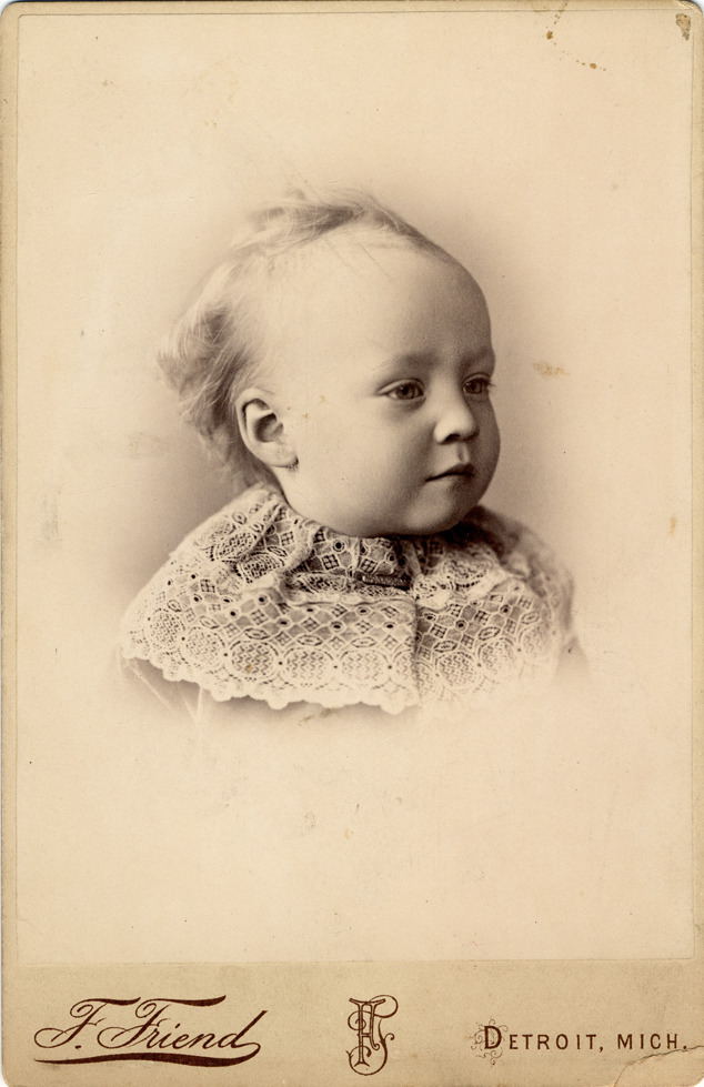 Head-and-shoulders portrait of unidentified infant. Wide lace collar secured by brooch. Printed on card front: "F. Friend, Detroit."