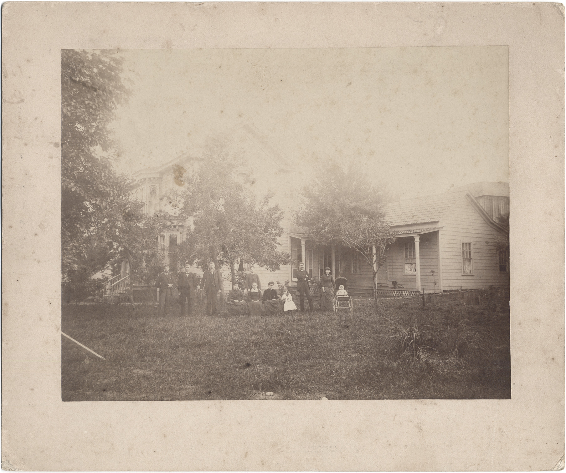 Large family posing in front of large house, seated women wearing dark dresses, standing men wearing suits, young girl next to baby in pram; side porch of large Victorian clapboard house in background. Written on photo back: "Al Woodworth group?" Image has spotting.