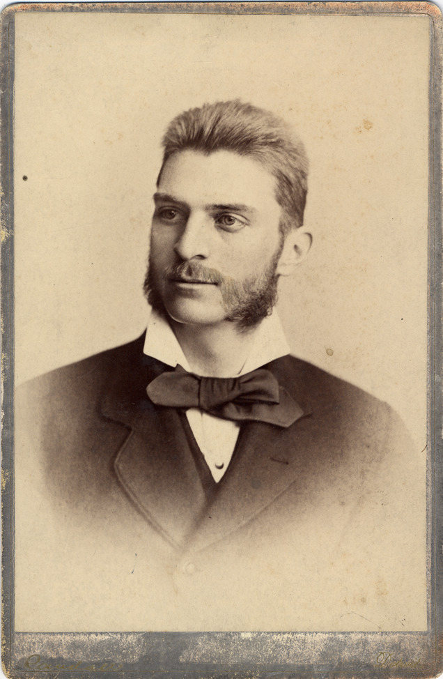 Studio portrait of unidentified man with beard and mustache wearing dark suit and bowtie. Printed on back: "Randall, photographer, 220 Woodward Ave. Detroit, Mich."