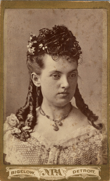 Studio head-and-shoulders portrait of unidentified young woman, wearing formal Victorian evening dress, hair gathered in ringlets with small flowers, hoop earrings and necklace. Printed on front: "Bigelow, NPA, Detroit." Printed on back: "Bigelow, photographer, No. 244 Woodward Avenue, Detroit, Mich."