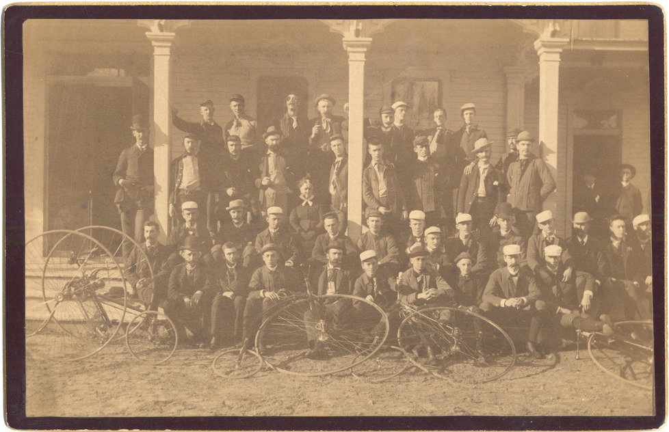 Group of men posed with high-wheel bicycles on porch of clapboard building. Most wear billed caps, a few wear hats. One women seated in center of group, not dressed for cycling. Printed on card back: "N.E. Richards, 23 Prescott Street, Toledo, O. Out-door work a specialty. Duplicates furnished." Handwritten on card back: "Possibly a Detroit group."