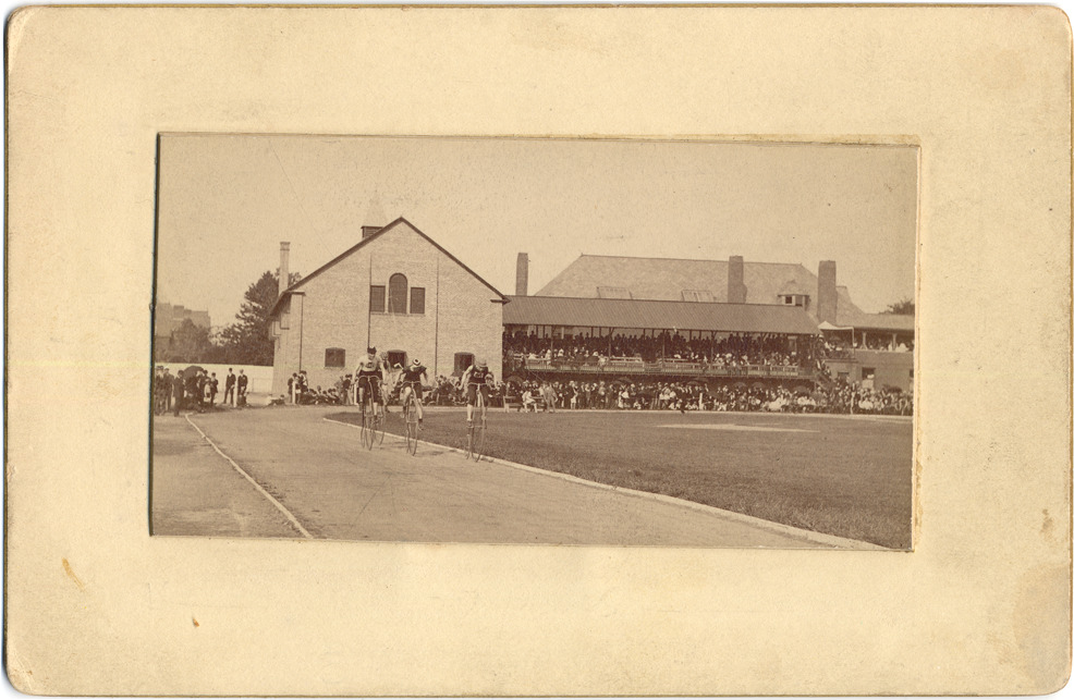 Favorite this☆ Bicycle race at Detroit Athletic Club Description: Four men racing high-wheel bicycles on track at Detroit Athletic Club. Spectators by track and in stands. Handwritten on card back: "Bicycle race on grounds of the Detroit Athletic Club, 1893." Details Resource ID: DPA2303 Subject: Bicycle racing--Michigan--Detroit Detroit Athletic Club Cabinet photographs Albumen prints Photographic prints Date Issued: 1893 Format: 1 cabinet card ; image 4 x 5.75 in. Member of: Burton Historical Collection Filing Location: D/Cycling Rights: Physical rights are retained by DPL. Copyright is retained in accordance with U.S. copyright laws.