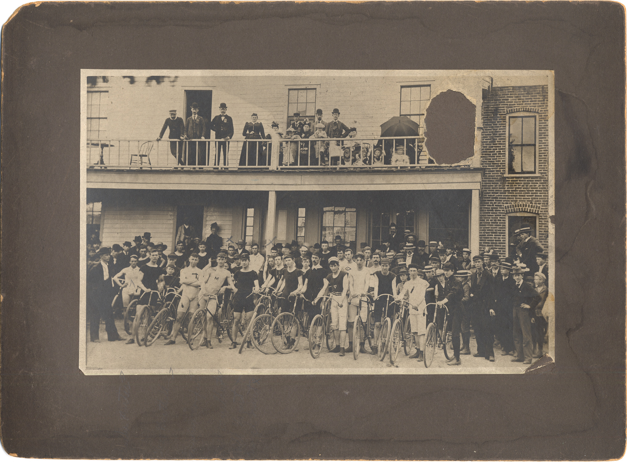 Group of cyclists in racing outfits in front of wide porch of clapboard building, next to brick building. Large group of people on porches and around cyclists. Some barely discernible names written in pencil on photograph front to identify individuals. Handwritten on mat back: "Richmond, Mich., 1894. [Lonnie?] Cooper, Charles Barthell, George D. Grant, Will W. Grant, Charlie Porter, Oscar Wanderer, Bill Hulbert. George and Will Grant won 1st and 2nd final purse, 1st and [2nd] position." Water damage to mat; tears on photograph, including oval removed from upper porch area.