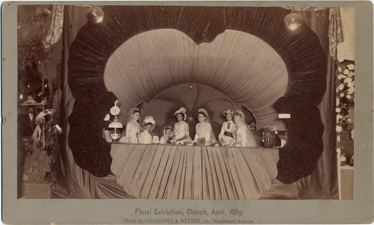 Favorite this☆ Women in pansy-decorated booth Description: Group of women posed in booth made to look like a pansy. Items on shelf at booth front. Printed on card front: "Floral Exhibition, April, 1889, photo by Holcombe & Metzen, 222 Woodward Avenue." Details Resource ID: DPA2312 Creator: Holcombe & Metzen Subject: Flower shows--Michigan--Detroit Exhibit booths--Michigan--Detroit Photographers--Michigan--Detroit Cabinet photographs Albumen prints Photographic prints Date Issued: 1889-04 Format: 1 cabinet card ; image 4.25 x 7.5 in. Member of: Burton Historical Collection Filing Location: D/Exhibitions-Detroit Floral Rights: Physical rights are retained by DPL. Copyright is retained in accordance with U.S. copyright laws.