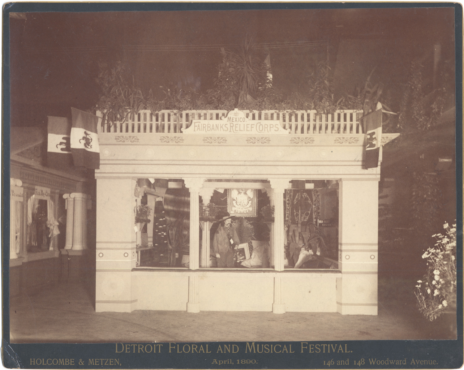 Booth from Detroit Floral and Musical Festival. Sign reads "Mexico Relief Corps." Mexican flags hang outside; interior of booth features Mexican products and a mannequin dressed in Mexican clothing. Printed on front: "Detroit Floral and Musical Festival, Holcombe & Metzen, April 1890, 146 and 148 Woodward Avenue." Back of photo has list of all booths and ladies involved in the exhibition.