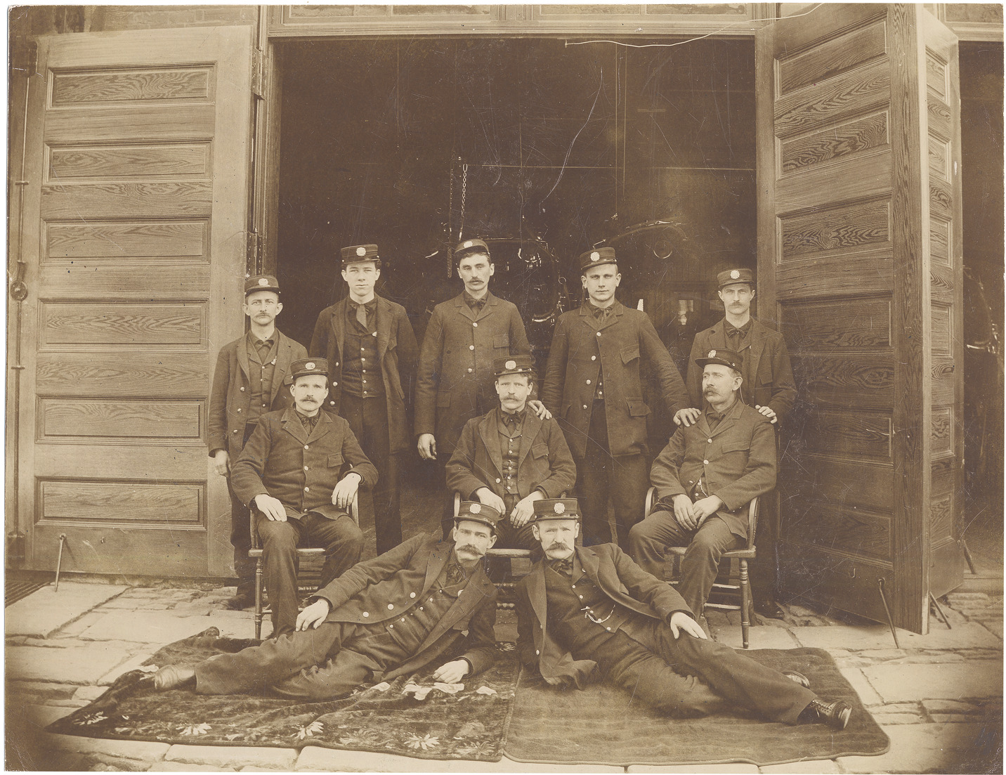 Favorite this☆ Group portrait of Detroit firefighters Description: Group portrait of uniformed company of Detroit firefighters, sitting and standing in front of open doors of fire station. Uniform consists of single-breasted coats and small hats with short brims. Details Resource ID: DPA2323 Subject: Fire fighters--Michigan--Detroit Portraits, Group Photographic prints Date Issued: Unknown year Format: 1 photographic print mounted on mat board ; image 7.25 x 9.5 in. Member of: Burton Historical Collection Filing Location: D/Fire Dept-Companies Rights: Physical rights are retained by DPL. Copyright is retained in accordance with U.S. copyright laws.