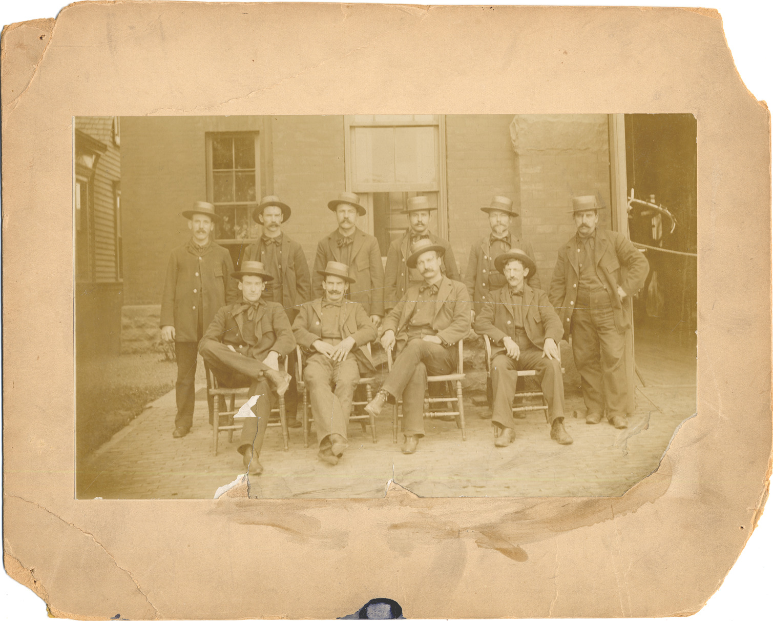 Favorite this☆ Group portrait of 1895 Detroit firefighters Description: Group portrait of uniformed company of Detroit firefighters, all wearing wide-brimmed hats. Handwritten on back: "Taken on July 4, 1895." Lower right corner of photo is torn away. Small portions missing from mat board. Details Resource ID: DPA2337 Subject: Fire fighters--Michigan--Detroit Portraits, Group Photographic prints Date Issued: 1895-07-04 Format: 1 photographic print mounted on mat board ; image 5 x 8 in. Member of: Burton Historical Collection Filing Location: D/Fire Dept-Companies Rights: Physical rights are retained by DPL. Copyright is retained in accordance with U.S. copyright laws.