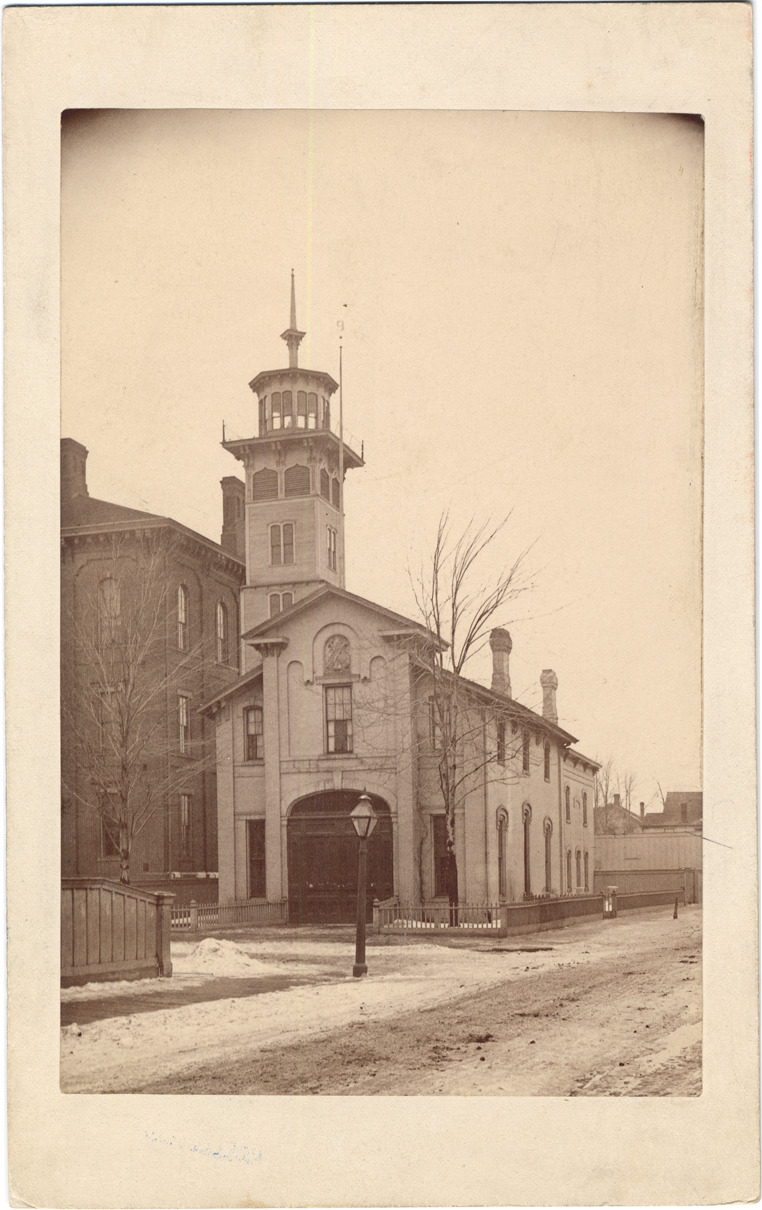 Favorite this☆ Detroit Fire Department engine house Description: Detroit Fire Department engine house (Engine Company #9) on Riopelle and Larned, built in 1849. Large station with watchtower. Handwritten on back: "Engine house, 1881, Larned & Riopelle Sts. built 1849." Details Resource ID: DPA2390 Subject: Fire stations--Michigan--Detroit Engine companies--Michigan--Detroit Photographic prints Date Issued: 1881 Format: 1 photographic print mounted on mat board ; image 6.5 x 4.25 in. Member of: Burton Historical Collection Filing Location: D/Fire Dept-Engine Houses-Larned and Riopelle Rights: Physical rights are retained by DPL. Copyright is retained in accordance with U.S. copyright laws.
