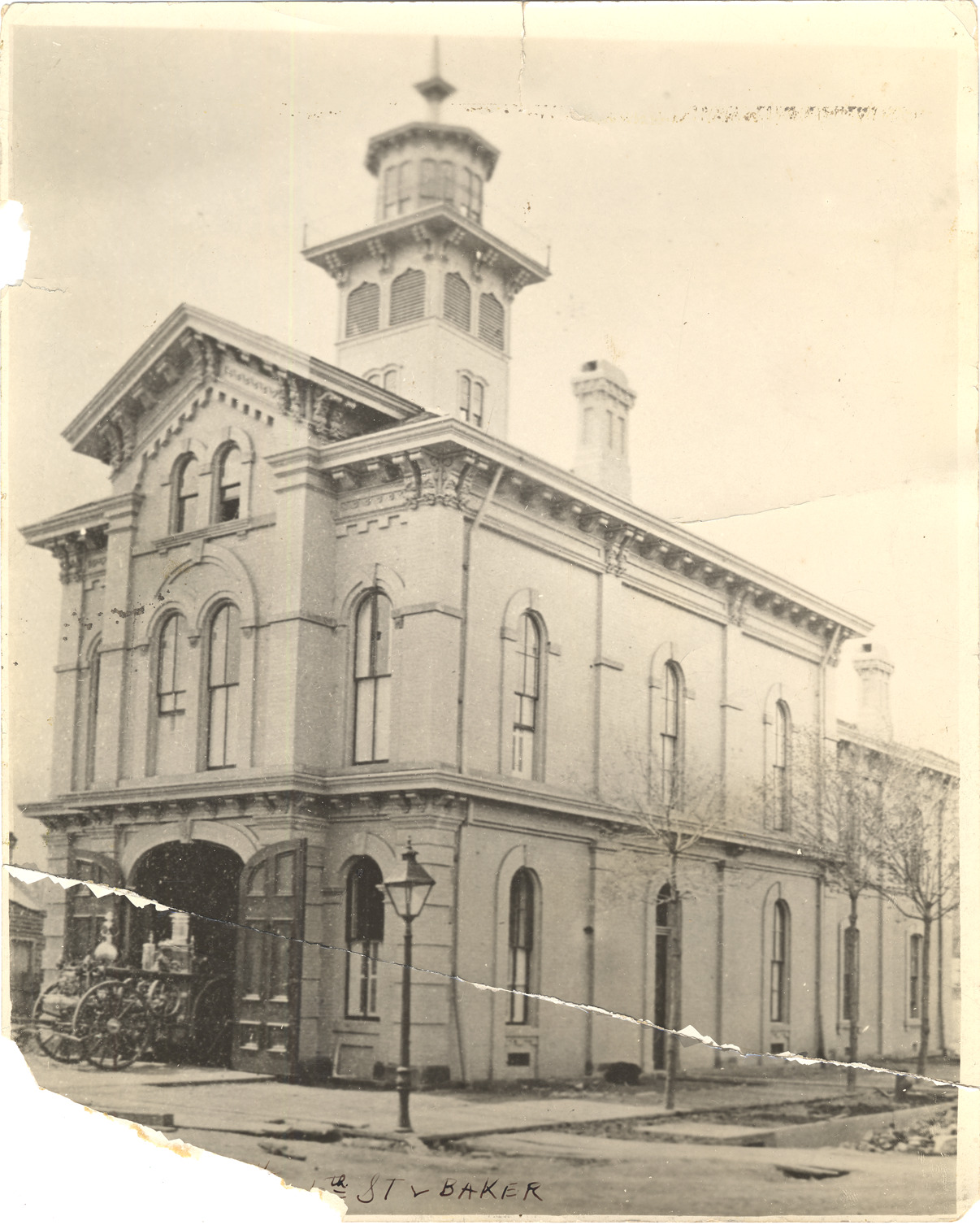 View of Detroit Fire Department engine house (Engine Company #4) on 6th Street and Baker. Large building with watchtower, fire engine protruding from open station doors. Handwritten on back: "Engine Co. no. 4, 6th St. and Baker, Engine 8, Det. F.D." Stamped on back: "H.P. Callahan, 6435 Lincoln Ave." Lower left corner torn away.