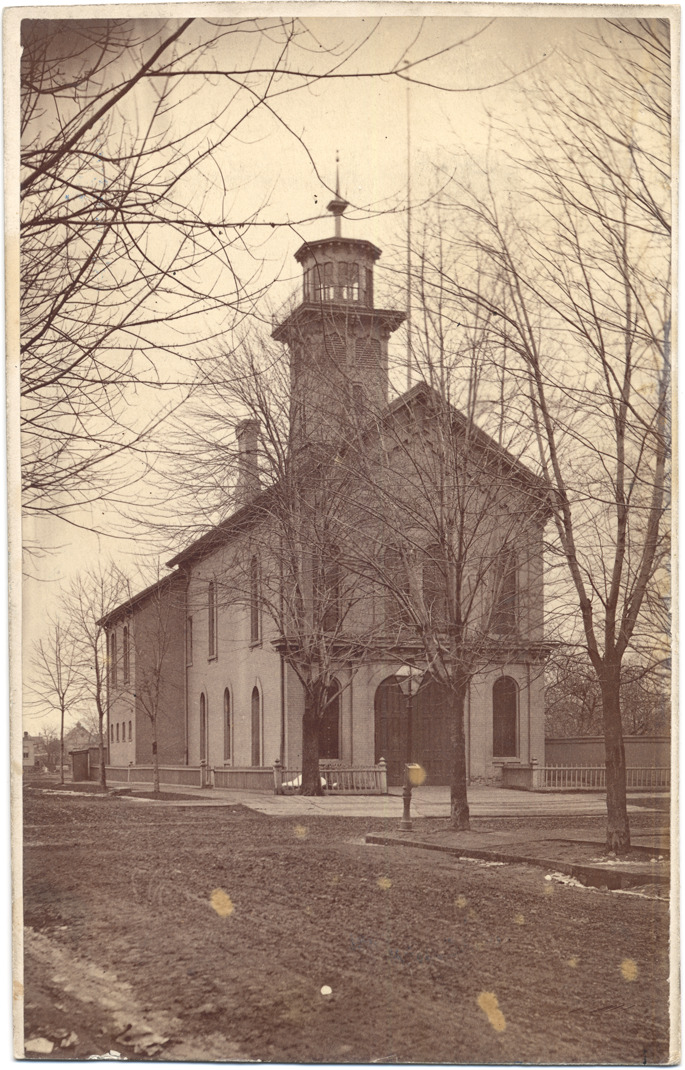 Brick fire station house with tower, viewed diagonally across unpaved intersection, through leafless trees. Stamped on mat back: "Farmer Bros., photographers, Detroit, Mich." Handwritten on mat back: "Engine House 1881, Fort & Elmwood Ave., Engine 7."