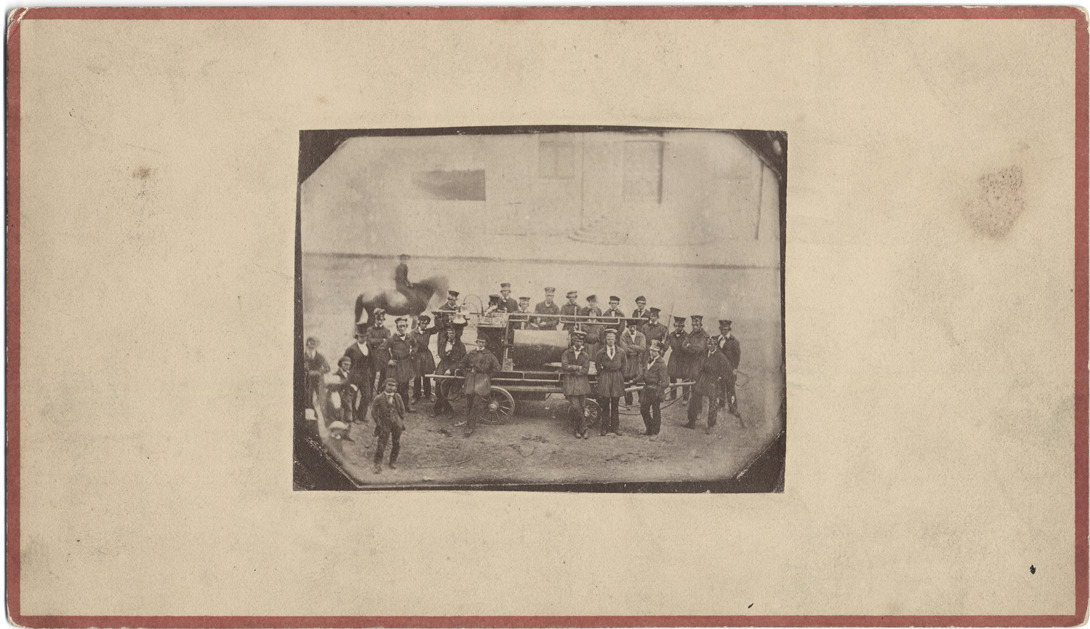 Favorite this☆ Engine Company 2 Description: Fire engine company posed around fire engine. Handwritten on card back: "Old no.2 Engine Co. in front of old session rooms on east side of Woodward Ave. about 1849." Details Resource ID: DPA2397 Subject: Fire engines--Michigan--Detroit Engine companies--Michigan--Detroit Cabinet photographs Albumen prints Photographic prints Date Issued: 1849 (year approximate) Format: 1 cabinet card ; image 2.5 x 3.25 in. Member of: Burton Historical Collection Filing Location: D/Fire Dept.-Equipment Rights: Physical rights are retained by DPL. Copyright is retained in accordance with U.S. copyright laws.