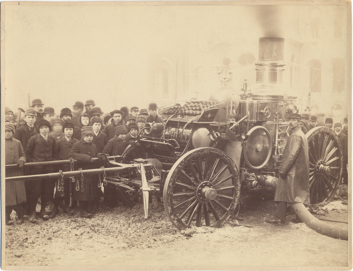 Crowd watching fire from behind steaming fire engine, with firefighter at hose. No horses in traces. Written on driver's seat: "Three." Stamped on mat back: "From Alvord & Co., exclusively commercial photographers, 55 Rowland St., Detroit, Mich., ground floor." Handwritten on mat back: "Burning of the high school, Jan. 27, 1893. Amoskeag engine."