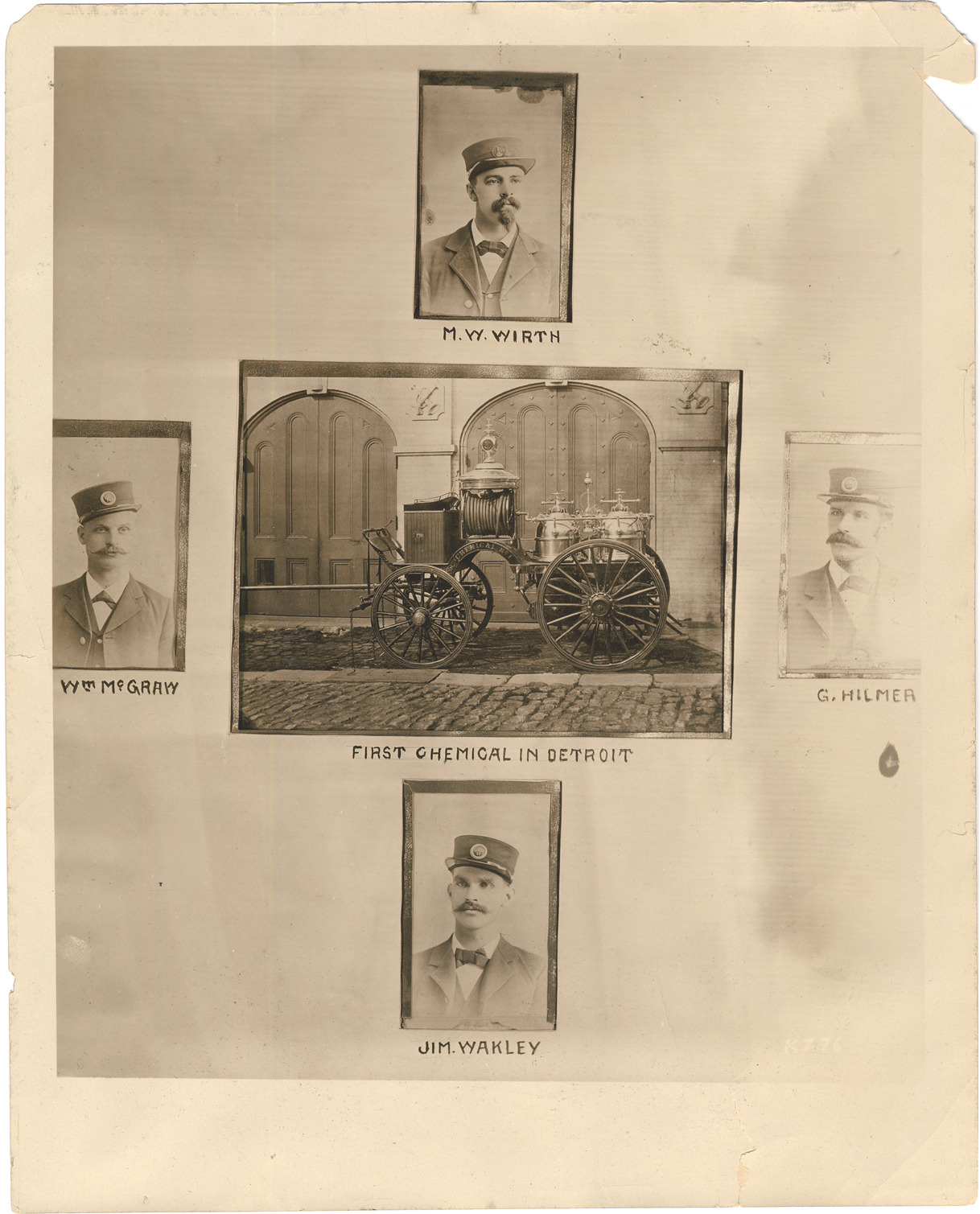 Photograph of five photographs on the wall: horse-drawn chemical fire engine in middle, with fire fighters arranged around it. Written on photograph: "First chemical in Detroit," "M.W. Wirth," "G. Hilmer," "Jim Wakley," and "Wm. McGraw." Handwritten on photograph back: "Babcock chemical engine. Ordered Oct. 1, 1876. Folder 3." Damaged edges.