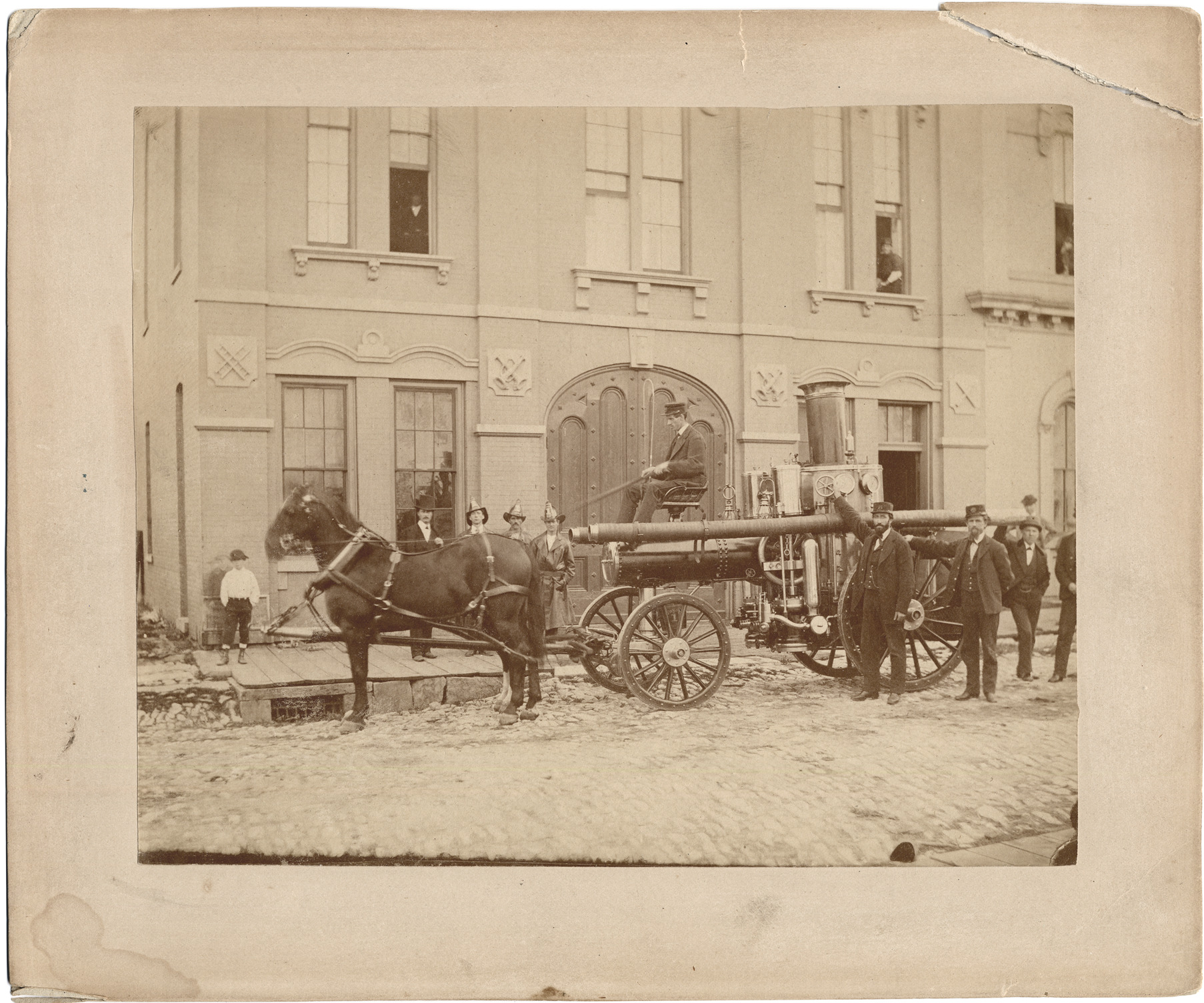 Fire fighters with horse-drawn steam fire engine in front of fire station. Handwritten on photograph back: "'Lafayette' Eng. Co. No. 1. First Amoskeag steam file engine ['to' crossed out] placed in service. First steam fire engine in the D.F.D., Oct. 1960 [1860]. Folder 3." Mat corner broken.