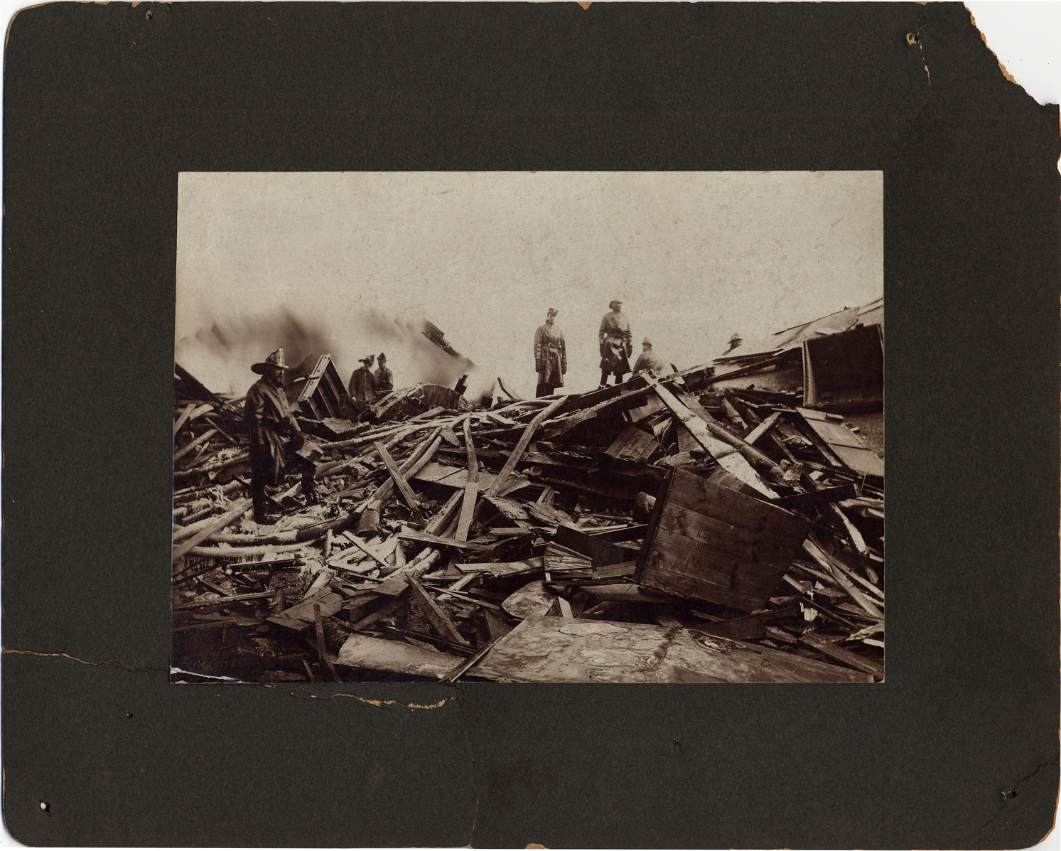 Fire fighters stand on smoking ruins of building. Stamped on mat back: "Herbert P. Callahan, [?]436 Lincoln Ave., Detroit, Michigan." Handwritten on mat back: "Ruins of Jan. 1902, Crusoe Bros., Jeff. Ave. and Shelby St. Left to right, Lieut. S. Kimberling E.16, J. Ahlick, unknown, [Walter F.?] Israel, Talbert [Edward Talbot?], [Casper J.?] Burkheiser, unknown. Jan. 17-1902, 182-92 Jefferson, W. 3rd alarm." Mat torn.