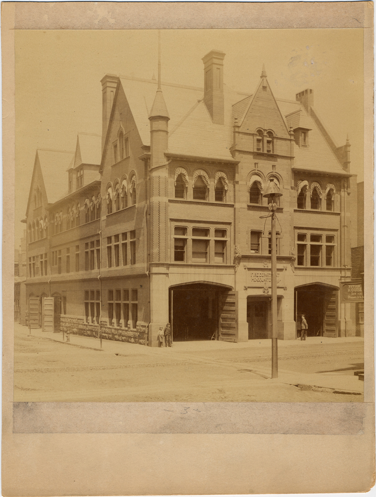 Brick building with garage-style doors, gables, and corner turret. Man standing by open door and two boys standing by corner. Written over entrance: "Fire Department Headquarters." Sign visible on right edge: "Butler House 1.00 per day." Stamped on mat back: "From Alvord & Co., exclusively commercial photographers, 55 Rowland St., Detroit, Mich., ground floor." Handwritten on mat back: "Detroit Fire Dep't. Headquarters, n.e. cor. Wayne and Larned."