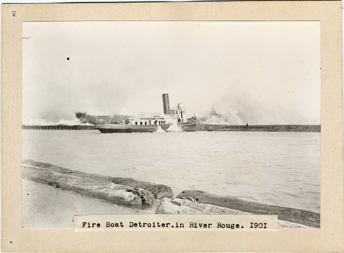 Fireboat "Detroiter" near far bank of River Rouge; log boom in foreground. Typed on label on mat front: "Fire boat Detroit in River Rouge. 1901." Handwritten on mat back: "Detroiter."