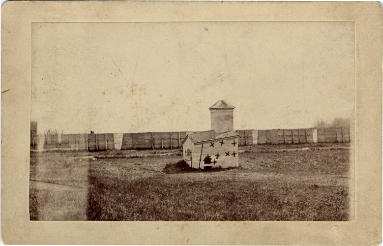 Powder magazine standing in field with walls of Fort Wayne in background. Handwritten on card back: "Magazine, Fort Wayne. 1870? [corrected to 1861] Folder 4 #2."