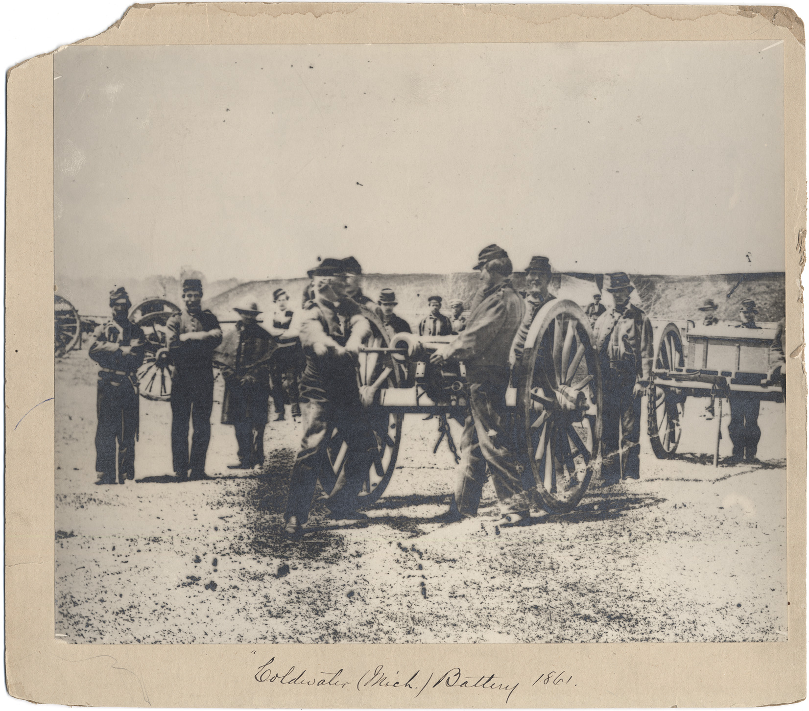 Favorite this☆ Coldwater Battery in cannon drill Description: Artillery drill in Fort Wayne. Handwritten on mat front: "Coldwater (Mich.) Battery, 1861." Handwritten on mat back: "Photographer Jex Bardwell, 1861." Corner torn off mat. Details Resource ID: DPA2474 Creator: Bardwell, Jex, 1824-1902 Subject: Drill and minor tactics--Michigan--Detroit Ordnance--Michigan--Detroit Photographers--Michigan--Detroit Albumen prints Photographic prints Date Issued: 1861 Format: 1 photographic print mounted on mat board ; image 8.25 x 10 in. Member of: Burton Historical Collection Filing Location: D/Forts-Wayne Rights: Physical rights are retained by DPL. Copyright is retained in accordance with U.S. copyright laws.