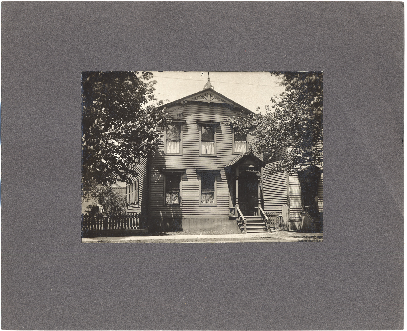 Favorite this☆ Unidentified clapboard house Description: Clapboard house with some decorated woodwork, beside another clapboard house. Pierced wooden fence, paved sidewalk, trees by street. Details Resource ID: DPA2484 Subject: Wooden-frame houses--Michigan--Detroit Architecture, Victorian--Michigan--Detroit Albumen prints Photographic prints Date Issued: Unknown year Format: 1 photographic print mounted on stock ; image 4.75 x 6.75 in. Member of: Burton Historical Collection Filing Location: D/Historic houses Rights: Physical rights are retained by DPL. Copyright is retained in accordance with U.S. copyright laws.
