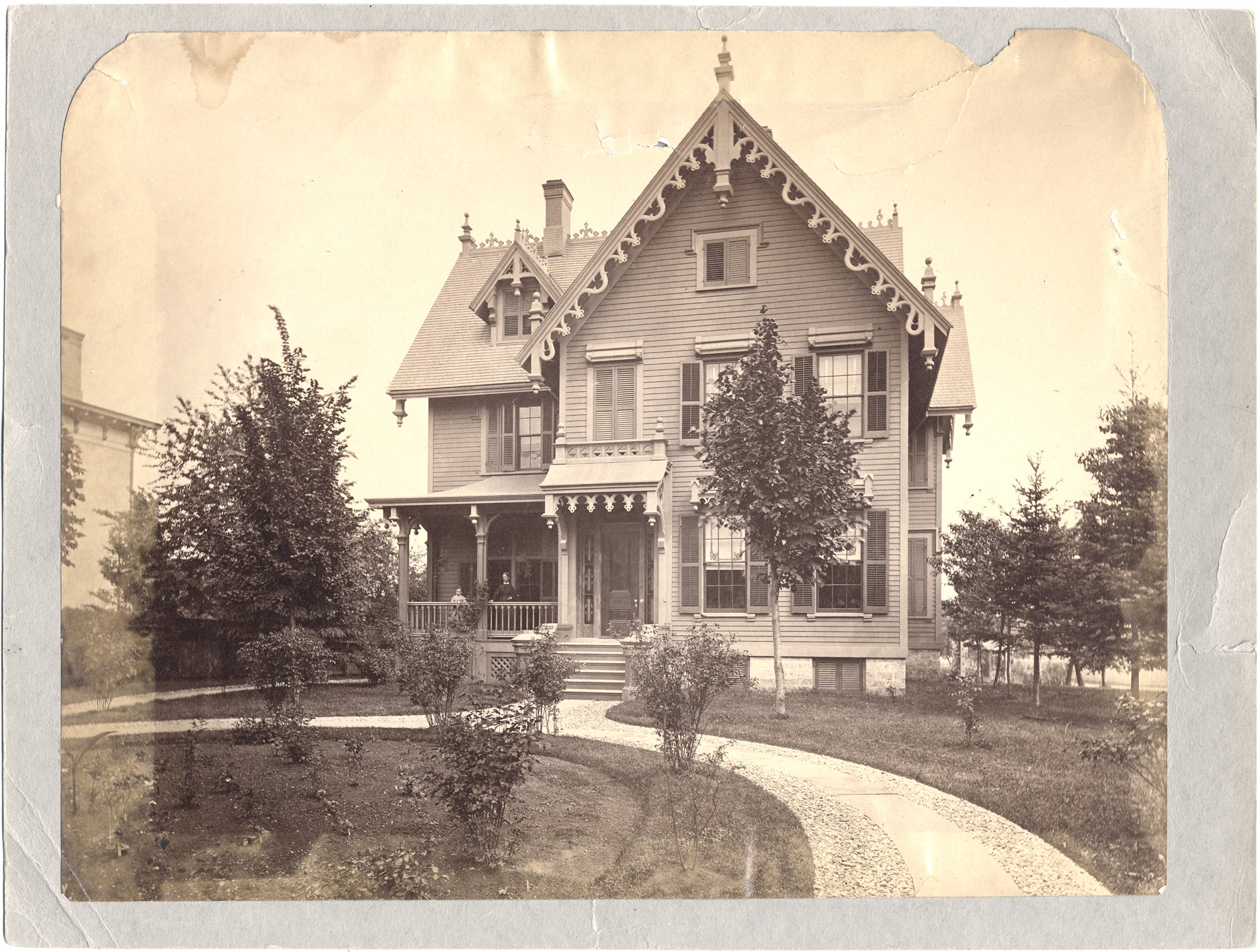 Clapboard house with wooden detail trim, on curved drive with trees. Woman and girl on porch. Other house on left. Handwritten on stock back: "Foot of W. Grand Blvd. at Fort St."