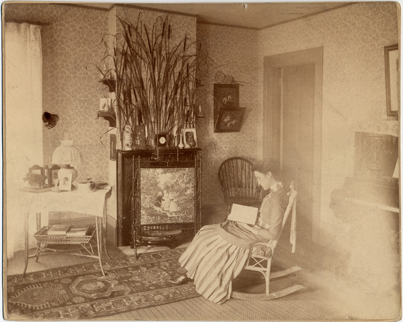 Interior of unidentified house. Woman sits reading in wooden rocking chair. Painted screen shields fireplace; large group of cattails decorate mantel above fireplace. Woven rug on floor, small table with Victorian lamp and several small portraits. Handwritten on back: "C.G.D.1885."