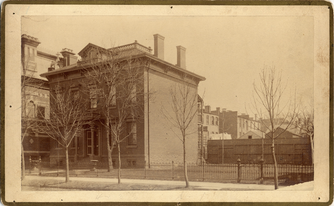 Two-story Colonial style brick house, surrounded by iron fence. Other residences seen in background. Located on Congress Street. Home of H.P. Bridge. Handwritten on back: "H.P. Bridge, Congress St. E., 1881."