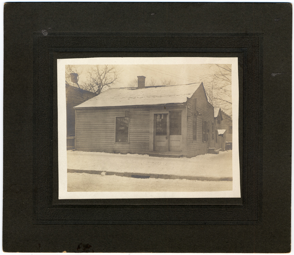 Small one-story clapboard house, boot-shaped sign hanging outside. Snow covers ground. Handwritten on back: "The Auld House, 3rd and Abbott Sts, where mother and father first stopped for a few days when they came to Detroit in 1855."