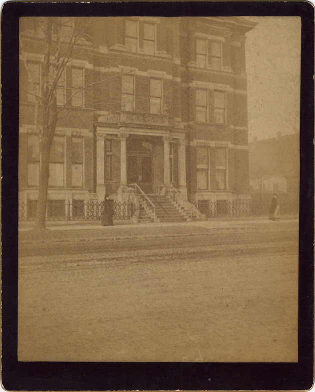Large three-story Italianate style house. Close up of front entrance, pillars on each side of front door and stairs in front. Woman on sidewalk, dirt road in foreground. Handwritten on back: "Residence of R.A. Alger, Fort at First." Printed on back: "Manufacturers of the Kodak Camera, The Eastman Company, 115 Oxford St., London, Rochester, N.Y."