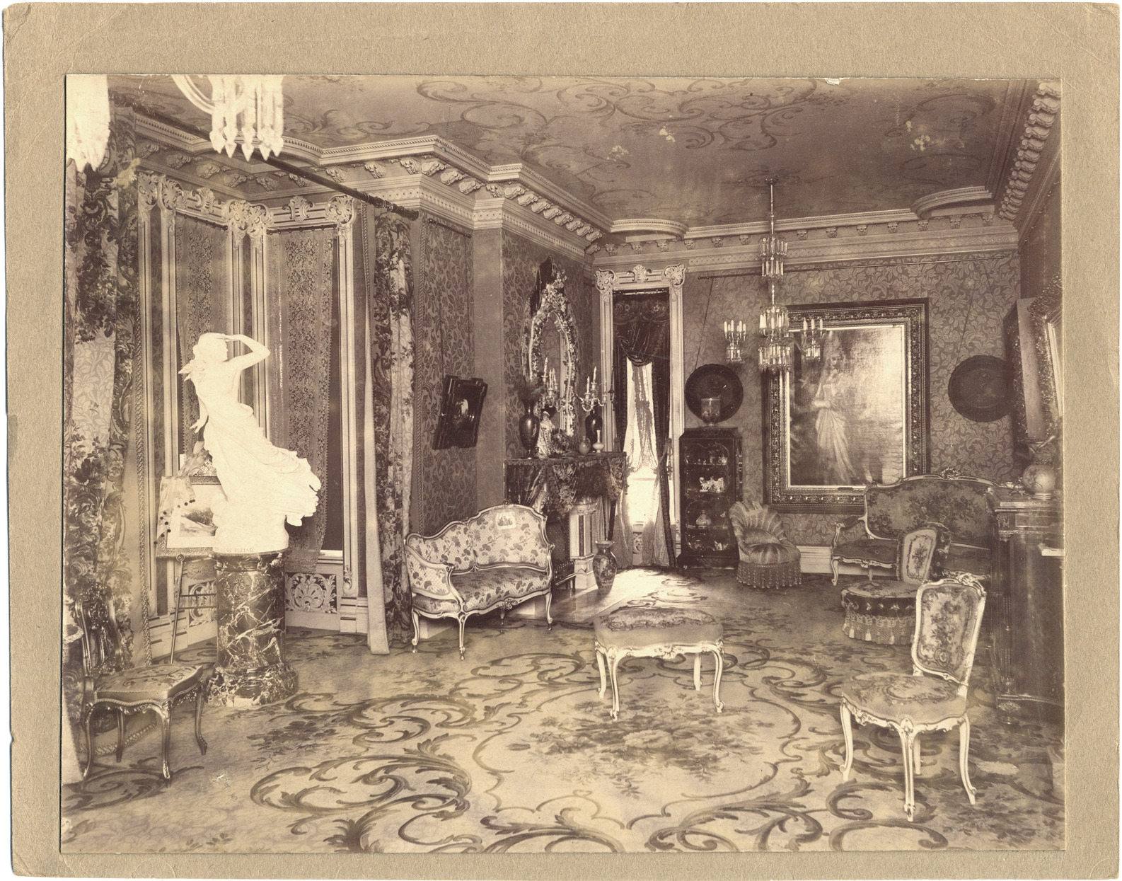 Favorite this☆ Interior of Hazen S. Pingree house Description: Interior of Hazen S. Pingree house. Living room is furnished with chairs, sofas and patterned rug. Paintings are displayed on walls; fireplace in background. "The lost Pleiad" sculpture by Randolph Rogers on left. Details Resource ID: DPA2538 Subject: Living rooms--Michigan--Detroit Living room furniture--Michigan--Detroit Pingree, Hazen S., 1840-1901--Homes and haunts--Michigan--Detroit Depew family Rogers, Randolph, 1825-1892 Marble sculpture, American Albumen prints Photographic prints Date Issued: Unknown year Format: 1 photographic print mounted on stock ; image 7.25 x 9.5 in. Member of: Burton Historical Collection Filing Location: D/Historic houses-Pingree, Hazen Rights: Physical rights are retained by DPL. Copyright is retained in accordance with U.S. copyright laws.