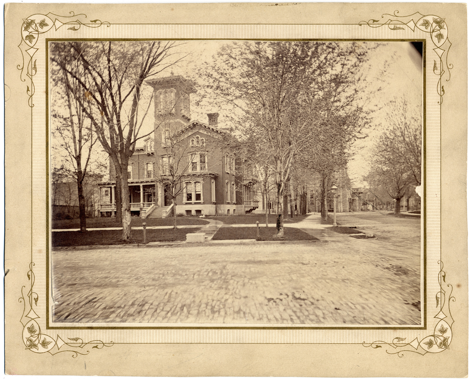 Three-story brick Italianate house with tall square cupola. Brick street and wooden sidewalks in foreground. Label on back: "Residence of Gov. John J. Bagley, 1832-1881. Site of Statler Hotel." Handwritten on back: "Washington & Park Avenues, 1881. Afterwards Michigan Conservatory of Music. Present site of the Statler Hotel, 1921."