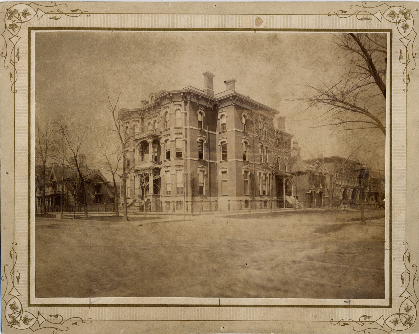 Large brick house decorated with columns on porches and bas-relief over tall windows, viewed diagonally across intersection. Metal fence around grounds; leafless trees; other houses visible down both streets. Handwritten on back: "110 W. Fort Street, 1881."