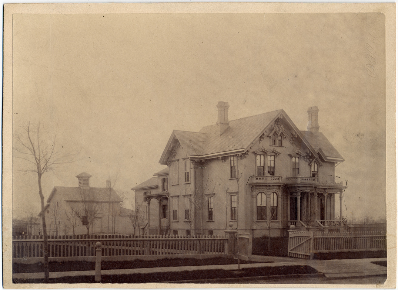 Brick house with clapboard extension behind picket fence, viewed at an angle from street; gingerbread on windows and roofline. Stable visible behind. Handwritten on mat back: "1095 Woodward, 1881. S.w. cor. Kirby and Woodward." Mat corner broken.