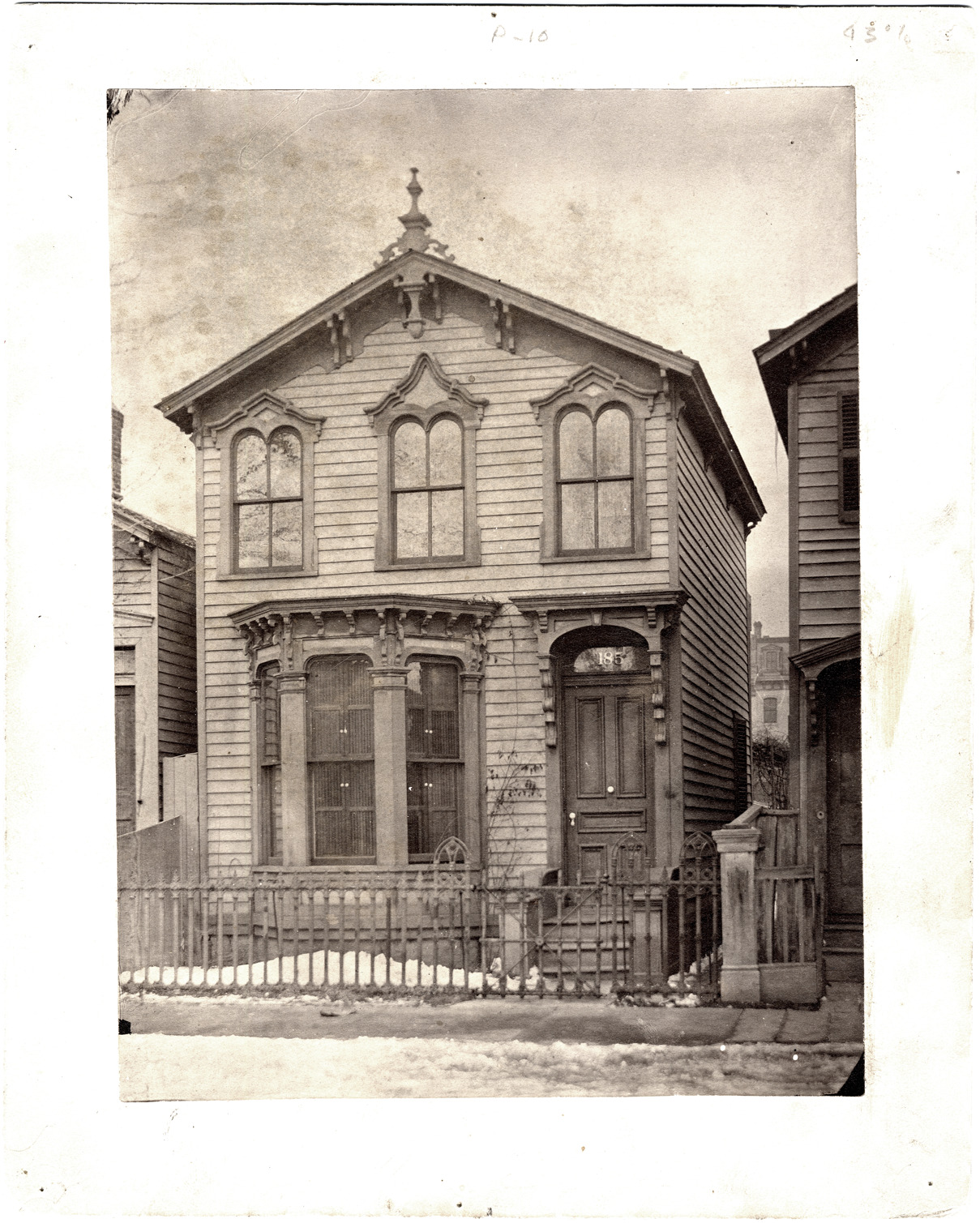 Clapboard house with bay window, behind metal fence, viewed from street. Some trim around windows, door, and roof. Narrow city lot; snow cleared from sidewalks. Handwritten on mat back: "Jno. Brown house, 185 Congress E. 1881. N. side betw. St. Antoine & Hastings. Property of Silas Farmer, Detroit, Mich."