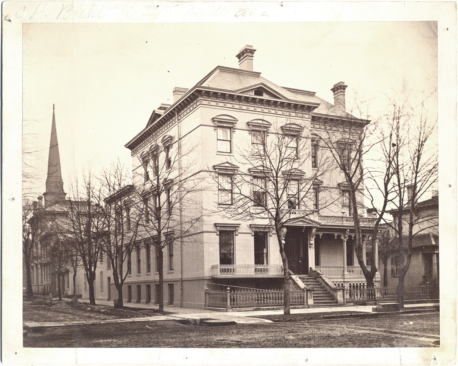 Tall brick house behind ornamental metal fence, viewed across unpaved intersection. Pediments on windows and doors, ornamental railings, detail at roofline. Leafless trees; other houses and church visible on both sides. Handwritten on mat front: "C.H. Buhl, 62 Lafayette Ave." Handwritten on mat back: "63 Lafayette Ave., 1882. 1A."