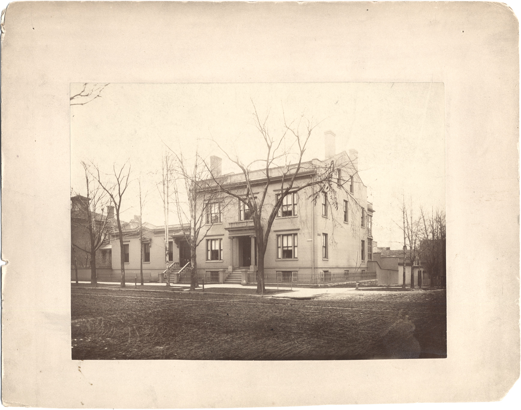 Two-story building, pillared entrance, one-story wing on left side with its own entrance. Bare trees and large front lawn in foreground. Handwritten on back: "Cass House. This is the house in which Gen. Cass died in 1866, owned by his daughter Mrs. Augustus Canfield."