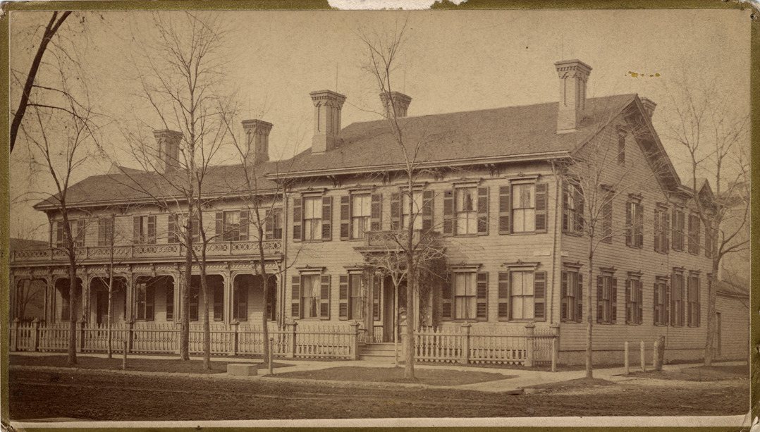 Colonial-style building, with shuttered windows, pillared entrance. Additional wings in back and on left side of house. Left side of building has wrap-around porch. Handwritten on back: "Gen. Lewis Cass's old homestead." Handwritten on back of duplicate: "Old residence of Gen. Lewis Cass, N.W. cor. Fort St. & Cass St., 1870; built 1840, removed in 1876." Printed on back: "New series, panoramic and cabinet sketches in and about the city of Detroit, photographed and published by Jex Bardwell, 31 Monroe Avenue."