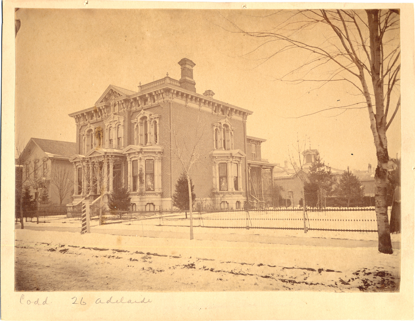 Brick Italianate house, viewed diagonally across sidewalk and metal fence. Leafless trees, other houses visible. Snow on ground and some on roofs. Handwritten on mat front: "Codd. 25 Adelaide." Handwritten on mat back: "Geo. C. Codd, 26 Adelaide St., 1881."