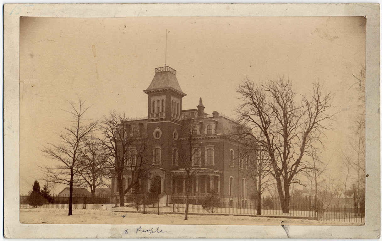Three-story Second Empire-style house, with square tower and rounded windows above entranceway. Surrounded by metal fence. Built in 1869 by architect Mortimer L. Smith, demolished in 1948. Handwritten on back: "Mrs. Charles Ducharme, 834 Jefferson Ave., 1881, demolished 1948."