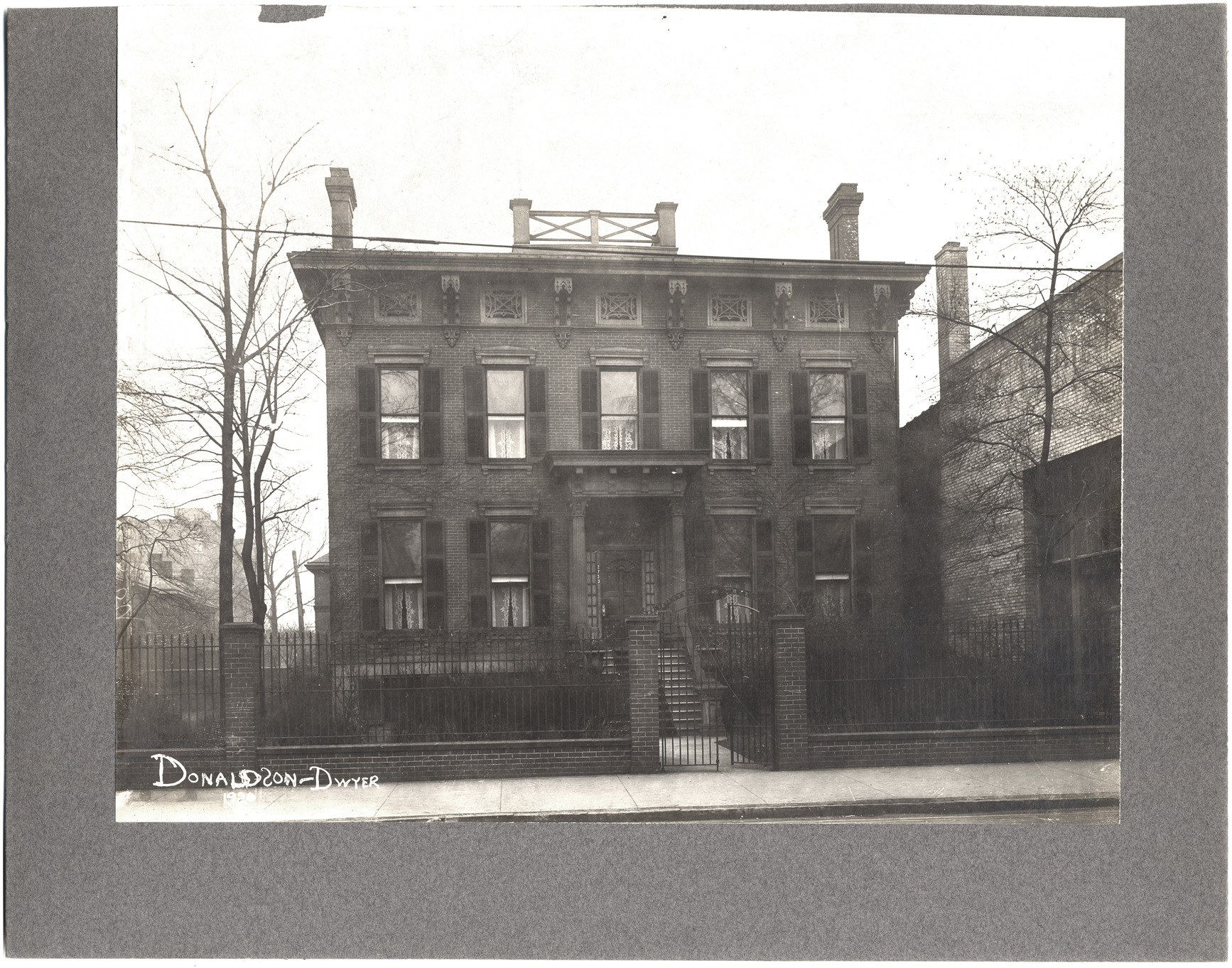 Two-story Colonial-style house. Front steps lead to pillared entranceway. Wrought iron fence in front; residential neighborhood in background. Handwritten on front: "Donaldson-Dwyer, 1920." Label on back: "457 (2733) Woodward Ave., home of Jacob S. Farrand, between Sproat & Temple (Bagg), 1881."