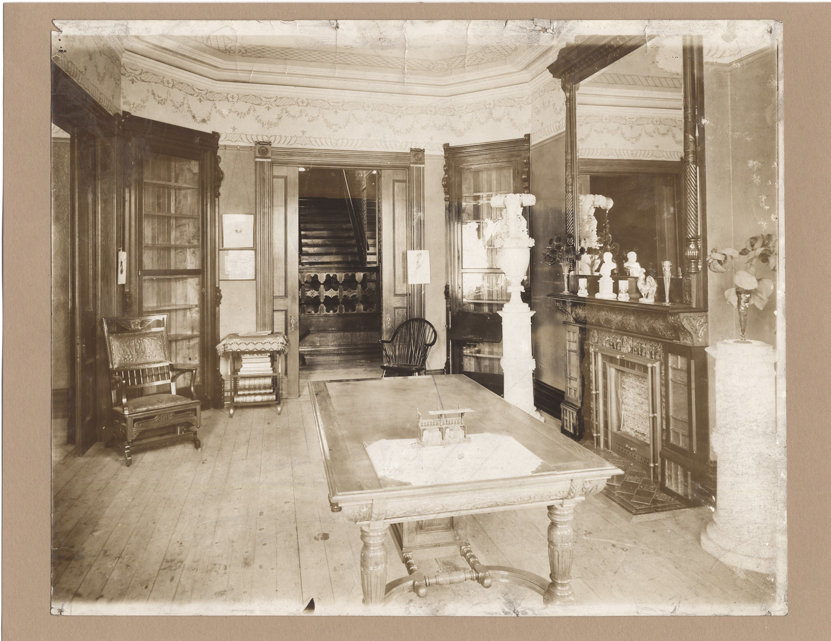 Residential interior, showing library and staircase. Glassed bookcases; library table with blotter and inkstand; tiled fireplace with plate glass mirror; pocket doors lead to staircase beyond. Handwritten on stock back: "465 Second Avenue, from the Farwell photograph album." Photograph wrinkled.