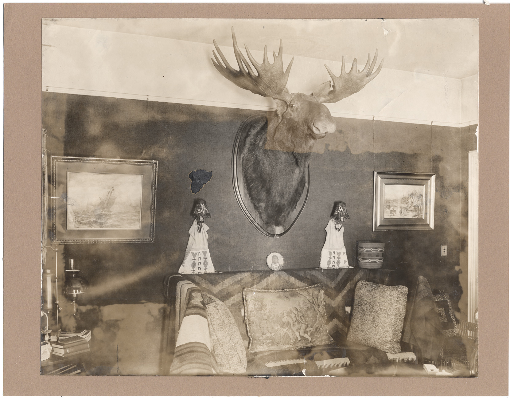 Residential interior, showing moosehead above sofa. Paintings; gaslamps on wall; spirit lamp in corner. Mix of southwestern and European influences. Handwritten on stock back: "From the Farwell photograph album." Photograph faded, has damage, wrinkled.