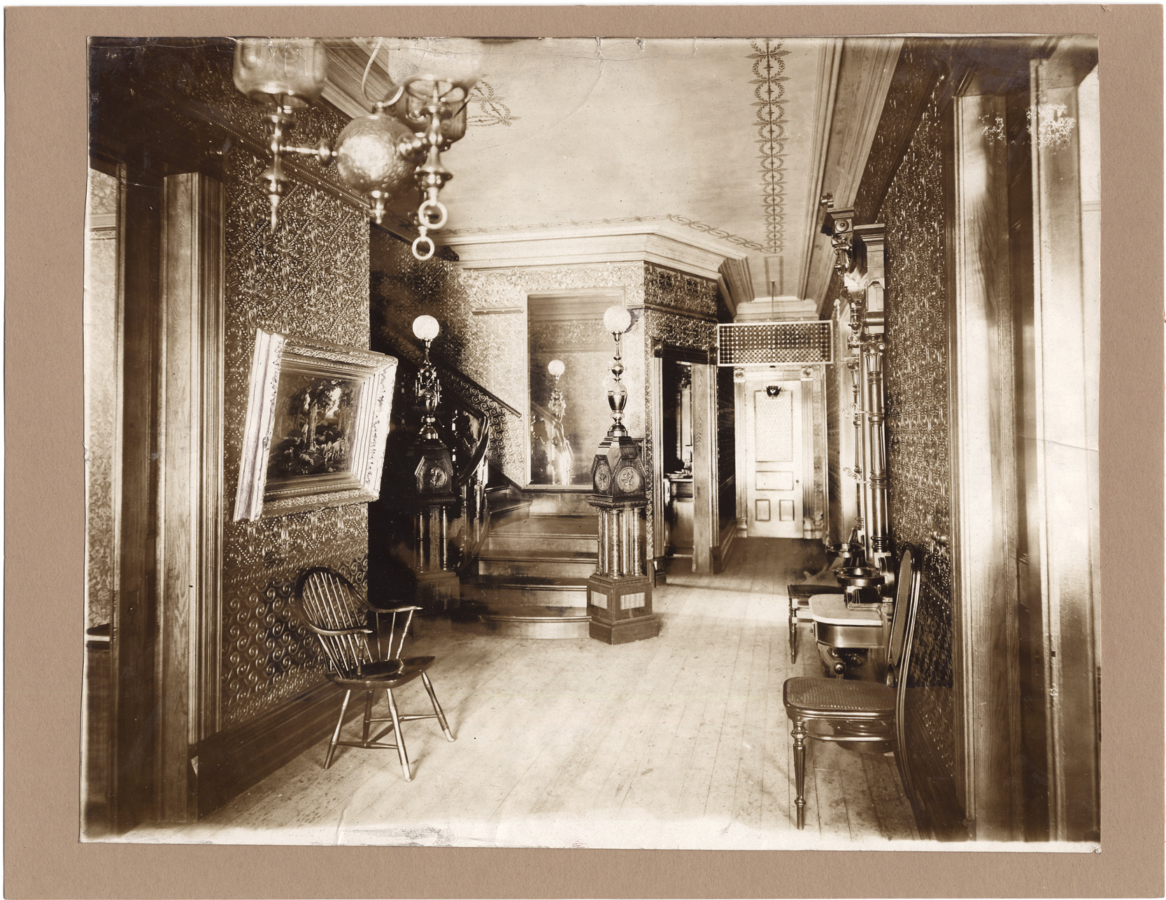 Favorite this☆ Hallway of Jesse H. Farwell residence Description: Residential interior, showing hallway with doors leading off and stairway. Hanging and standard gaslamps. Handwritten on stock back: "From the Farwell photograph album." Photograph is somewhat wrinkled. Details Resource ID: DPA2631 Subject: Entrance halls--Michigan--Detroit Staircases--Michigan--Detroit Albumen prints Photographic prints Date Issued: Unknown year Format: 1 photographic print mounted on stock ; image 7.75 x 9.75 in. Member of: Burton Historical Collection Filing Location: D/Historic houses-Farwell, Jesse H. Rights: Physical rights are retained by DPL. Copyright is retained in accordance with U.S. copyright laws.