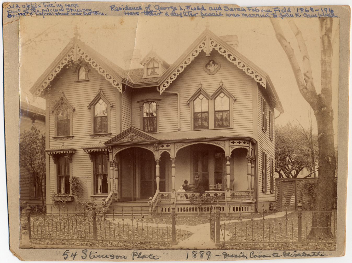 Clapboard house with gingerbread vergeboards and porch along the front; window boxes on first floor; viewed across decorative metal fence. Two women and child on porch. Handwritten on mat front: "Old apple tree in rear; part of original Stimson orchard before street was put there. Residence of George L. Field and Sarah Folsome (?) Field 1868-1916. Here their daughter Jessie was married to John R. Campbell. 54 Stimson Place, 1889. Jessie, Cora, & Elizabeth."