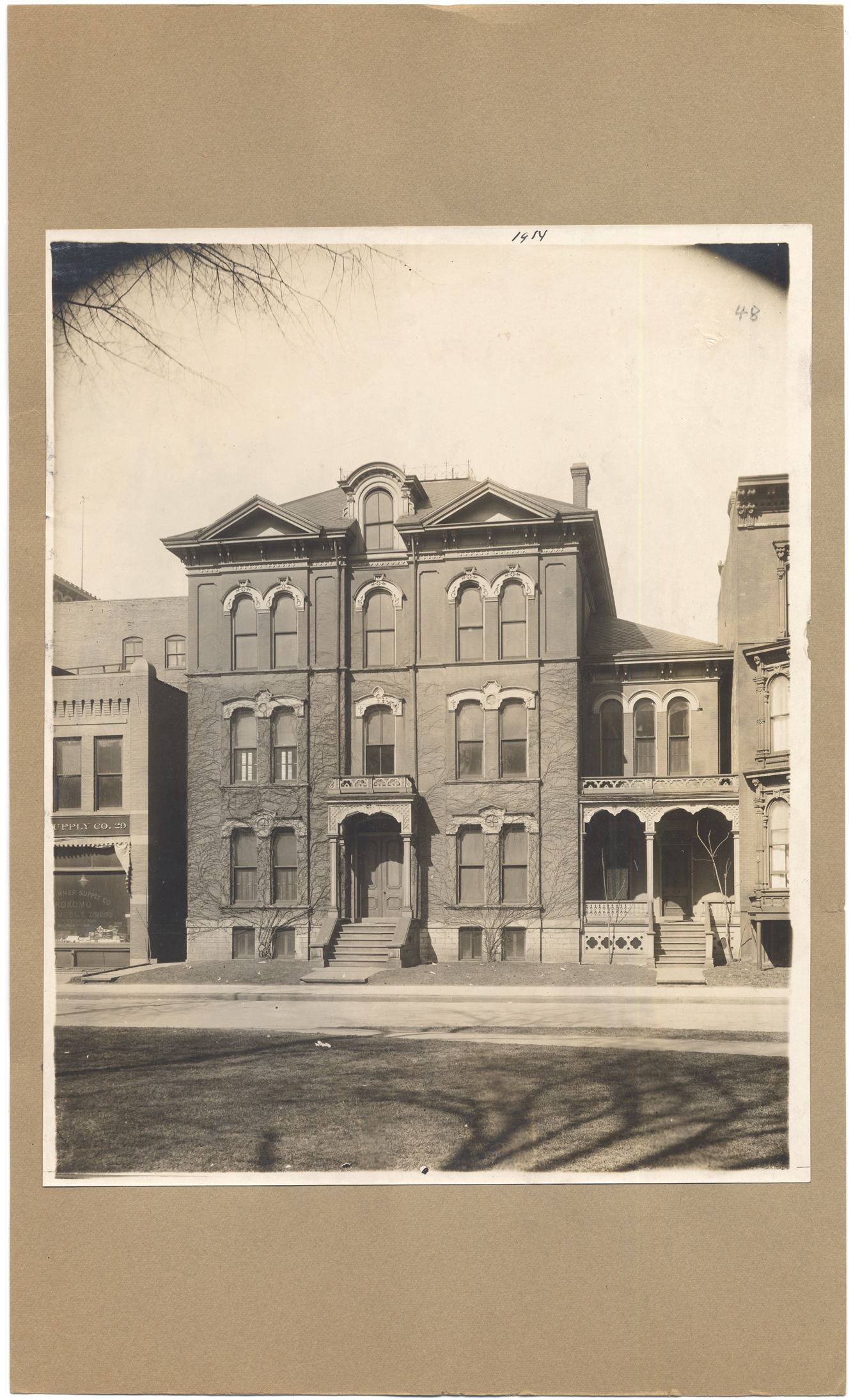 Neo-classical brick building with small front yard, viewed at a slight angle from across street. Other buildings either side, some residential. Handwritten on stock back: "Bishop John S. Foley residence, Washington Blvd (no.31-33), 1914." In 1910 Detroit City Directory, shop in no.29 is J.H. Wimmer Supply Co.
